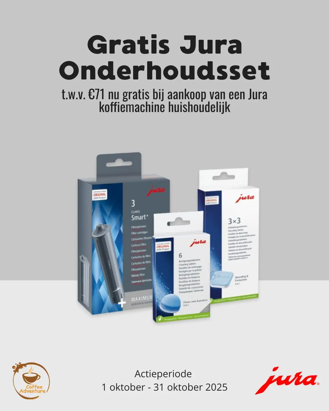 Bij aankoop van een Jura koffiemachine huishoudelijk krijg je deze maand een Jura onderhoudsset t.w.v. €71 helemaal gratis!