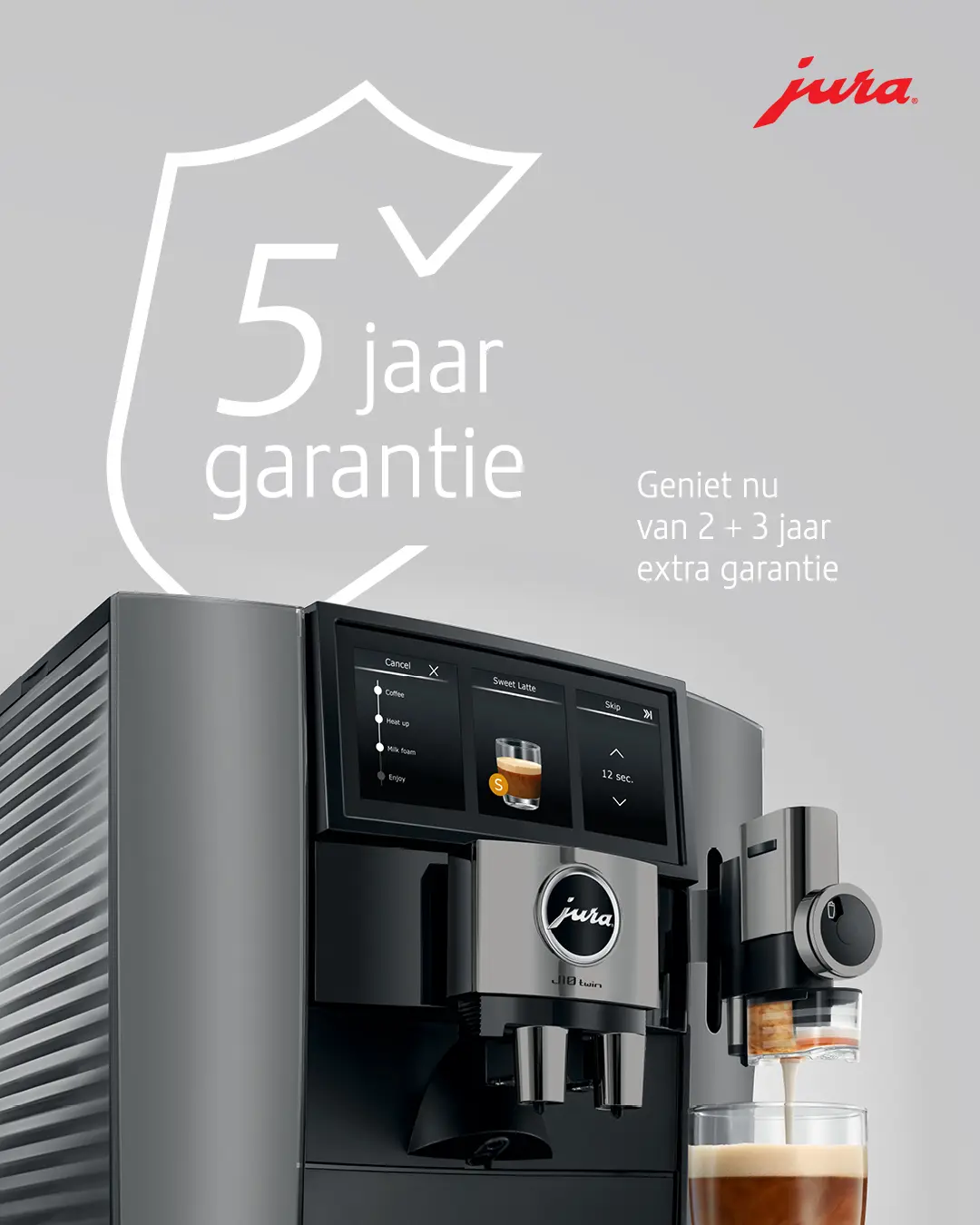 Bij aankoop van een deelnemende Jura koffiemachine ontvang je tijdelijk 3 jaar extra garantie bovenop de standaard 2 jaar.