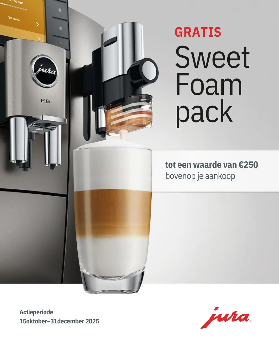 Bij aankoop van een deelnemend Jura-toestel ontvang je tijdelijk een gratis Sweet Foam Pack, zodat je jouw koffiebeleving thuis naar een hoger niveau tilt.
