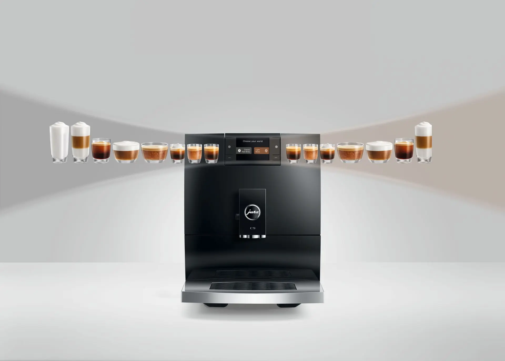 Qua uiterlijk sluit de C9 naadloos aan bij de premiumklasse van JURA. Het waterreservoir is vormgegeven met stijlvolle golfstructuren en het verchroomde kopjesplateau springt elegant in het oog. De licht gebogen voorzijde straalt luxe uit en integreert het 2,8” kleurendisplay harmonieus in het totale design.