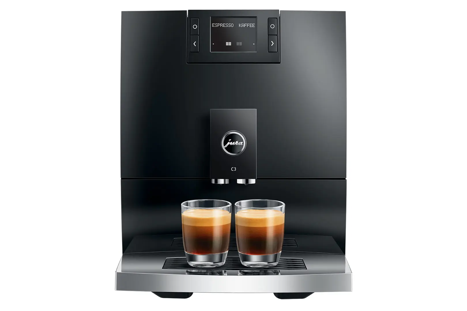 De JURA C3 is een volautomatische koffiemachine voor thuis of kleine kantoren, uitgerust met een Professional Aroma Grinder voor optimale aroma’s. Met één druk op de knop bereid je zwarte koffies en espresso’s van topkwaliteit.